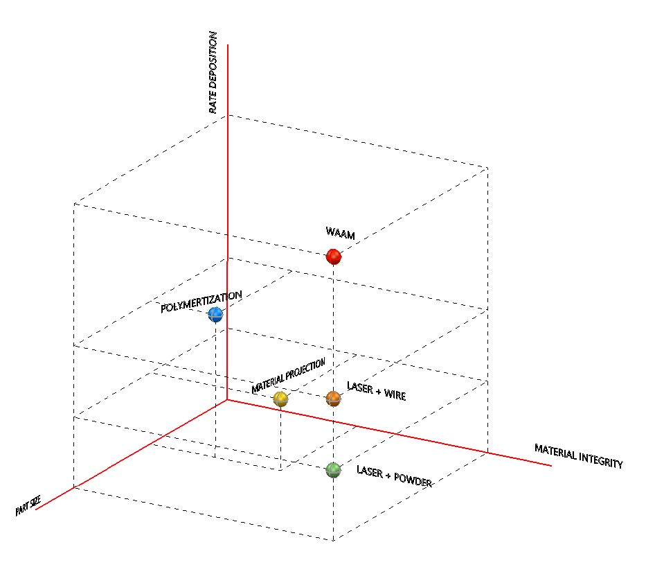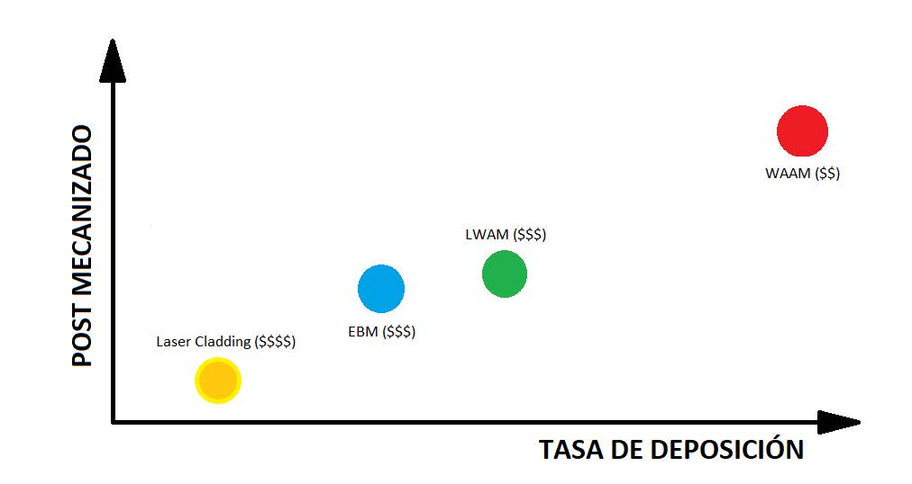 Estas técnicas se conocen como DED (Directed Energy Deposition) y entre ellas se encuentran WAAM (Wire Arc Additive Manufacturing), LWAM (Laser Wire Aditive Manufacturing), Laser Cladding o Cold Spray.
