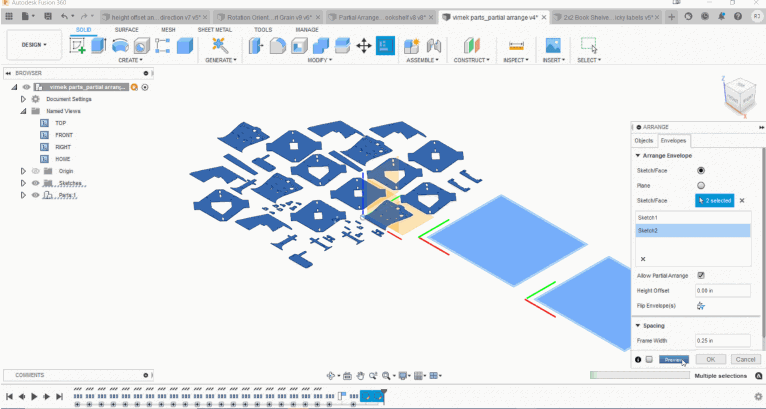 Hasta ahora, Organizar devolvería un error si no podía ajustar todos los objetos seleccionados en el área especificada. El error le pedirá que reduzca el número de objetos seleccionados o que aumente el área del sobre. Esto a menudo requería varios intentos para marcarlo correctamente. Según sus comentarios, hemos agregado una nueva opción para Permitir arreglos parciales. Cuando está habilitado, producirá una disposición exitosa con tantos objetos como pueda caber dentro del área disponible. Todos los componentes no organizados se resaltan en la lista y se dejan en su ubicación original en el lienzo. La belleza de esta mejora está en la forma en que maneja los componentes desordenados. A menos que se eliminen explícitamente, se mantienen en la lista de objetos. Esto conserva la intención original y resalta el verdadero poder de su naturaleza paramétrica al permitir que la función de arreglos se actualice dinámicamente a medida que se modifica el diseño de la pieza y / o el tamaño de la envolvente.
